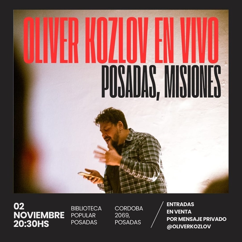 Con más de un millón de reproducciones en Spotify y 50 millones de reproducciones de sus videos en las redes sociales, el escritor y comunicador Oliver Kozlov presenta su recital de poesía este sábado, a las 20.30, en la Biblioteca Popular Posadas (Córdoba 2069). Entrada: $3.000 al perfil de instagram @OliverKozlov o vía WhatsApp al 379 4128873.