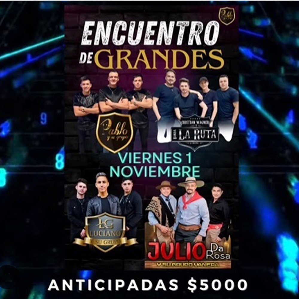 Para disfrutar de buena música llega este sábado a las 22, un encuentro de grandes amigos y mucho baile con Luciano y su Grupo; y Julio da Rosa en el Polideportivo Municipal. Entrada: Anticipadas $5.000.