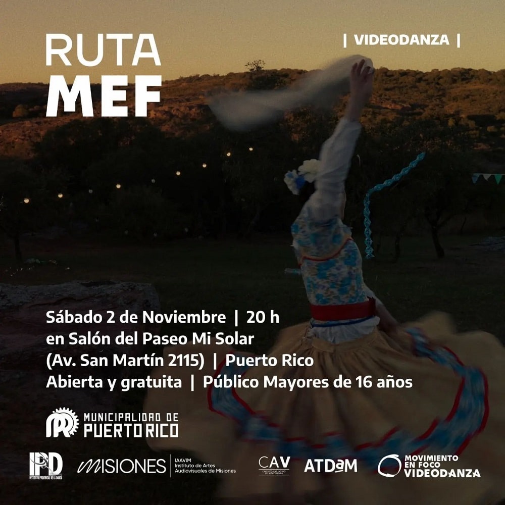 La Ruta MEF, busca a dar a conocer el lenguaje de la videodanza con producciones colectivas, este sábado, a las 17, en el Salón Cultural Eibl (Avenida San Martín KM11), de Eldorado y luego a las 20 en el Paseo Mi Solar, de Puerto Rico. La entrada es libre. Solicitar ingreso en el perfil de redes sociales del @ipdmisiones