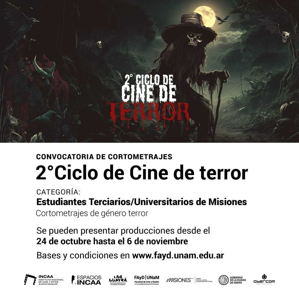 En el marco del 2° Ciclo de Cine de Terror, que se realizará del 14 al 17 de noviembre en Oberá, se abrieron dos convocatorias para participar de la exhibición de cortometrajes de género de Terror. El cierre de inscripciones es el 6 de noviembre. Bases y condiciones en la página Web de la Facultad de Arte y Diseño de la Universidad Nacional de Misiones www.fayd.unam.edu.ar.