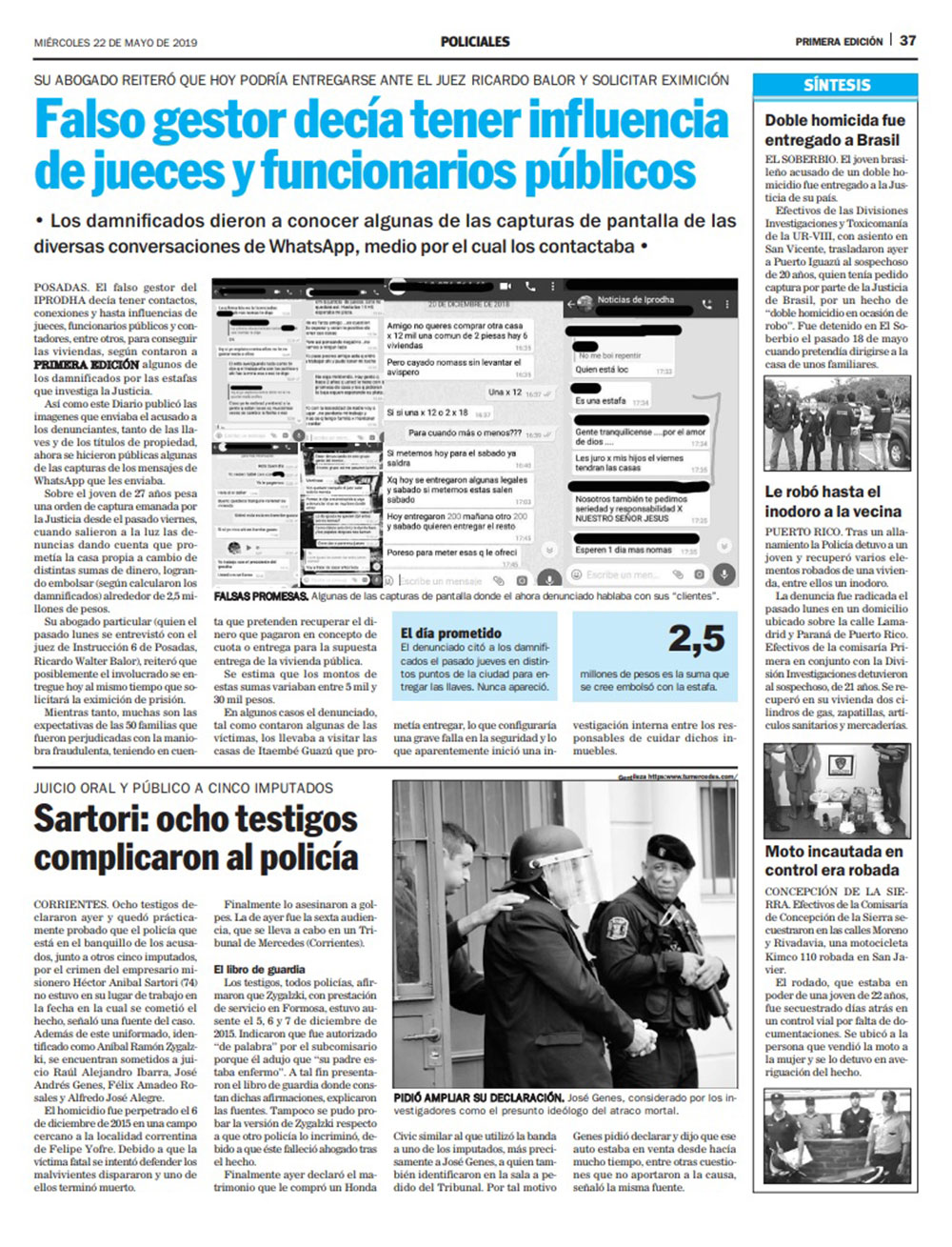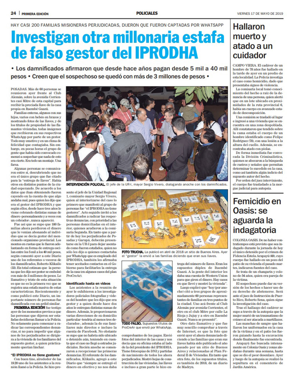 Las primeras denuncias por estafas contra el falso gestor de IPRODHA trascendieron el 16 de junio de 2019. No concurrió a ninguna de las tres reuniones que habría prometido el supuesto tramitador a sus “clientes” para entregarles las llaves y puedan ir a ver sus futuros hogares en el complejo habitacional en el paraje Itaembé Guazú.
