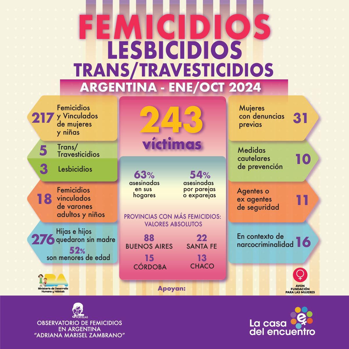 Argentina enfrenta un panorama alarmante en lo que va del 2024, con 243 víctimas fatales de violencia de género. El Observatorio de Femicidios en el país “Adriana Marisel Zambrano”, de La Casa del Encuentro, reporta que entre los casos se registraron 217 femicidios de mujeres y niñas, 3 lesbicidios, 5 transtravesticidios y 18 femicidios vinculados de varones adultos y niños. A causa de estos crímenes, 276 niñas y niños han quedado sin madre, de los cuales el 52% son menores de edad.
