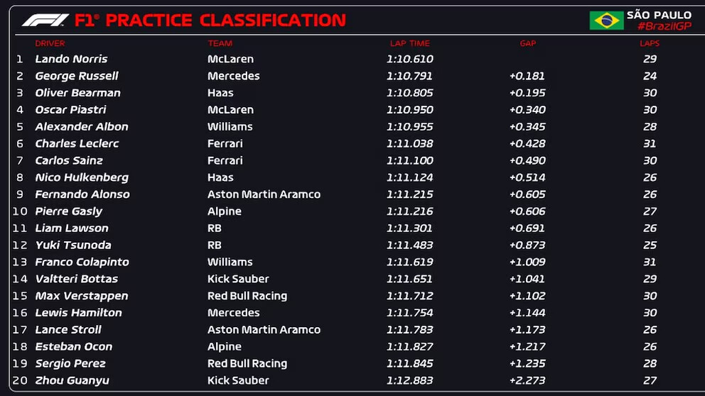 Cabizbajo, Franco Colapinto llegó esta mañana al padock de Williams para afrontar el primer y único entrenamiento del fin de semana. Durante la hora de ensayos, junto al equipo fueron probando el vehículo y tras varios giros quedó en la posición número 13 quedando a 1.009 de Geroge Rusell. Su compañero de equipo Alex Albon quedó 5to y la gran revelación fue el rookie Oliver Bearman, con Hass.