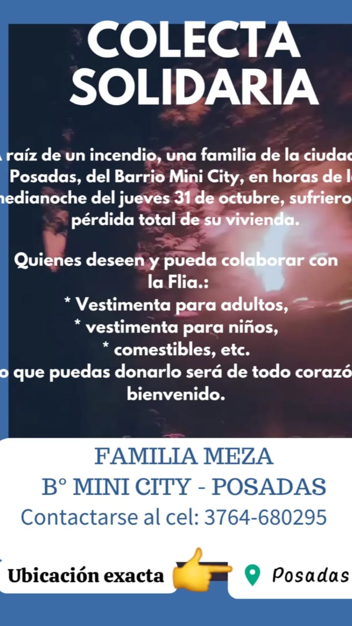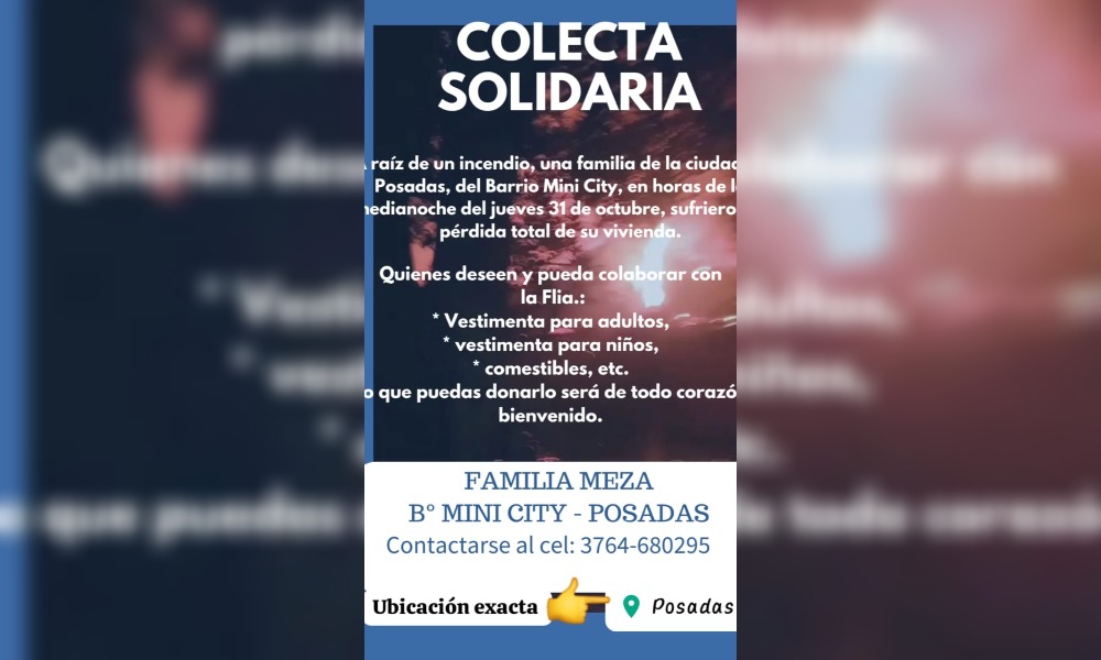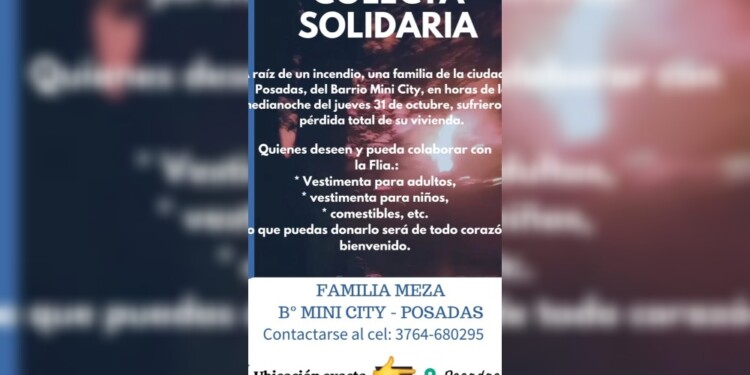 Una familia de la ciudad de Posadas, residente en el barrio Mini City, sufrió la pérdida total de su vivienda debido a un incendio ocurrido en la medianoche del jueves 31 de octubre. En respuesta, iniciaron una colecta solidaria para ayudar a los afectados, quienes perdieron todas sus pertenencias.