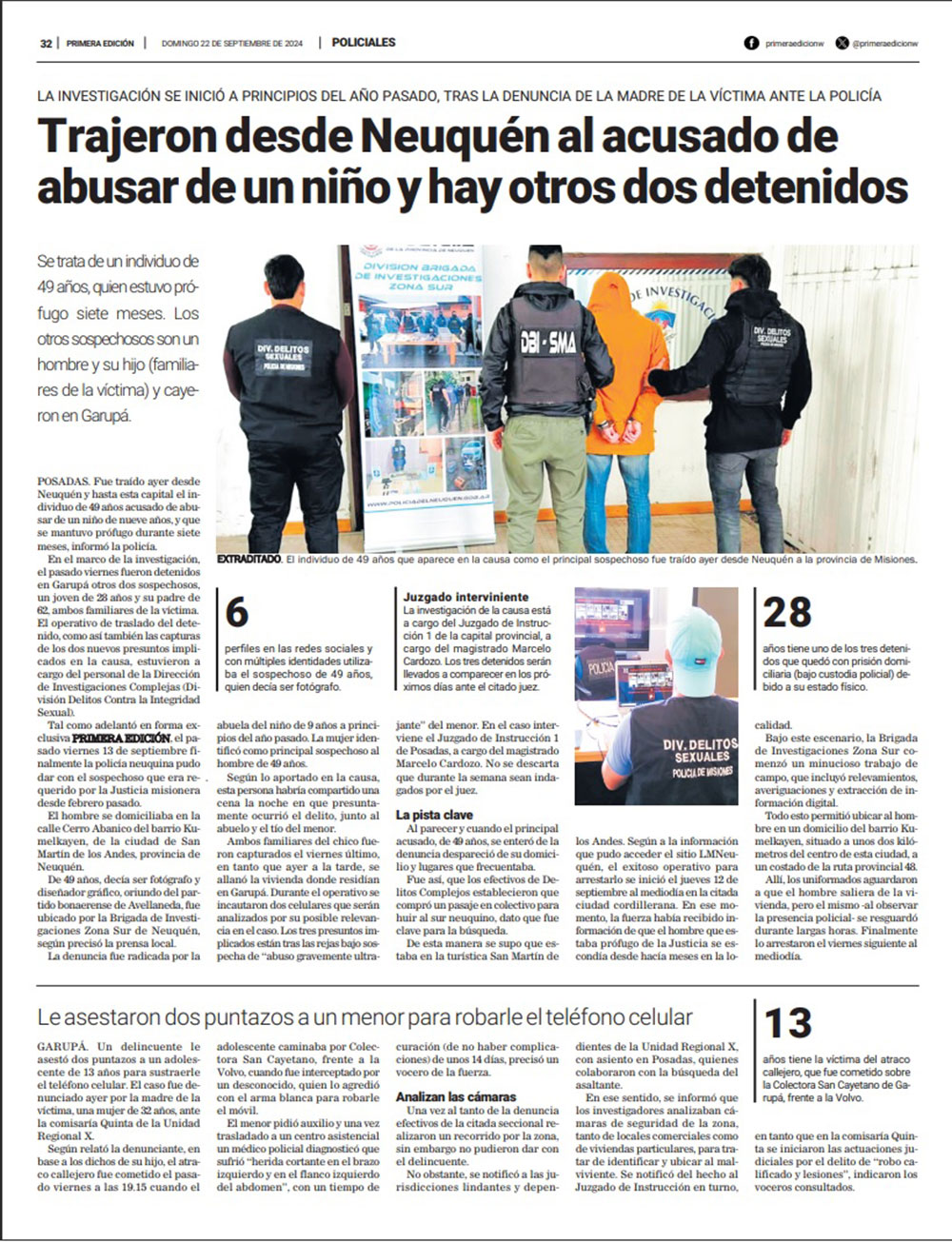 Tras la detención el 13 de septiembre pasado en San Martín de los Andes, Neuquén, de un misionero prófugo por un presunto abuso sexual múltiple de un niño de 9 años en Garupá a principio de este año, el juez de Instrucción 1, Marcelo Cardozo, ordenó a la división Delitos Sexuales de la Dirección Investigaciones Complejas de la Policía, la aprehensión de la madre de la víctima y, con este procedimiento, ya suman cuatro los sospechosos detenidos en la causa.
