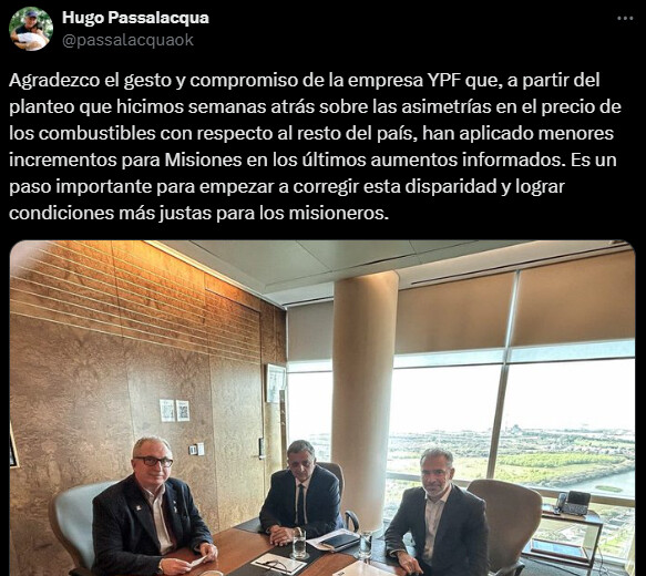 Semanas atrás, el gobernador había elevado su reclamo al presidente de YPF, señalando que Misiones registraba uno de los precios más elevados en combustibles, una situación que evidenciaba una gran disparidad respecto a otras provincias. Según comentó Passalacqua en un posteo en X, los últimos ajustes de precios de YPF aplicaron incrementos menores en Misiones, un avance que consideró como “un paso importante para empezar a corregir esta disparidad y lograr condiciones más justas para los misioneros”.