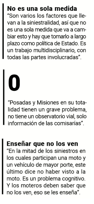 Casadei comentó que cuatro de cada diez víctimas fatales de accidentes de tránsito son personas que circulaban en moto “y si uno hace el cálculo, toma el total de víctimas fatales y lo compara con la cantidad de habitantes de cada provincia, Santiago del Estero y Misiones son las dos provincias que tienen más víctimas fatales en motocicleta del país. Y si uno lo compara con la cantidad de vehículos, digamos con la flota automotor de motos, Misiones es la provincia que, en relación a la cantidad de motos que tiene, posee la mayor cantidad de víctimas fatales en el país. Así que la verdad que las estadísticas son terribles”.