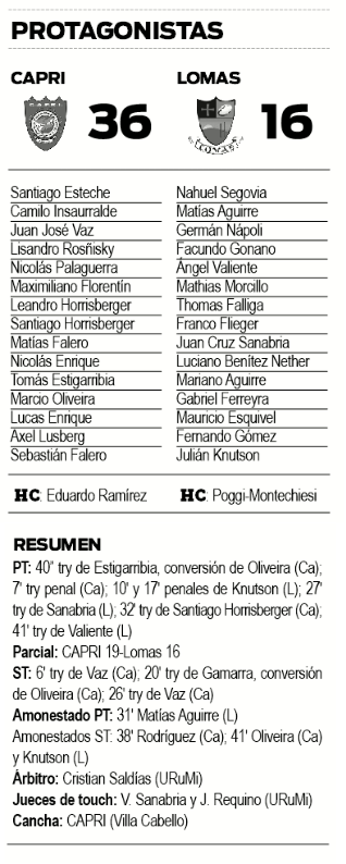 Fueron los últimos puntos del partido, que cerraron el marcador final en 36-16 y le dieron la consagración a CAPRI, que volvió a festejar un campeonato en el ámbito doméstico.