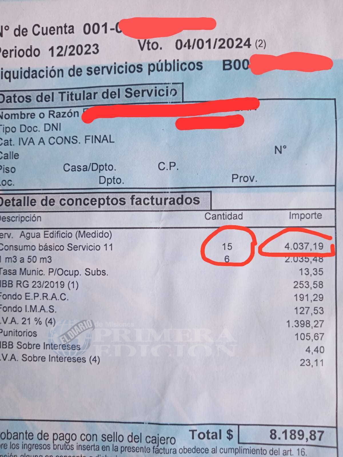 Usuarios del servicio de agua potable de la Posadas y Garupá enviaron sus facturas a PRIMERA EDICIÓN para demostrar que los incrementos aplicados por la empresa Samsa en los primeros diez meses del año, desde enero a octubre, han trepado a más de 350%. A eso se deberá sumar otro 10% que ya fue autorizado por el Gobierno y se cobrará en el consumo de noviembre.