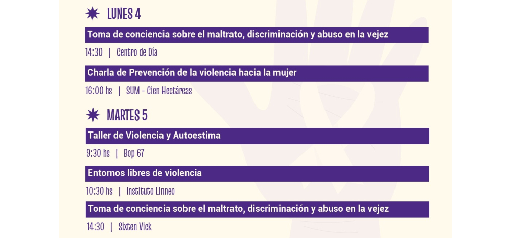 Como parte del mes de prevención, este lunes comenzará con una charla a las 14.30 horas en el Centro de Día, donde se tratarán temas relacionados con el maltrato, la discriminación y el abuso hacia las personas mayores. Posteriormente, a las 16 horas, habrá una charla sobre la prevención de la violencia hacia la mujer en el Salón de Usos Múltiples de Cien Hectáreas.