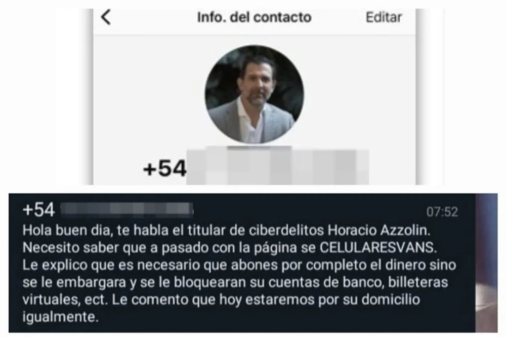 “Hola buen día, te habla el titular de ciberdelitos Horacio Azzolin. Necesito saber qué ha pasado con la página CELULARESVANS. Le explico que es necesario que abones por completo el dinero sino se le embargará y se le bloquearán sus cuentas de banco, billeteras virtuales, etc. Le comento que hoy estaremos por su domicilio igualmente”, dice el mensaje.