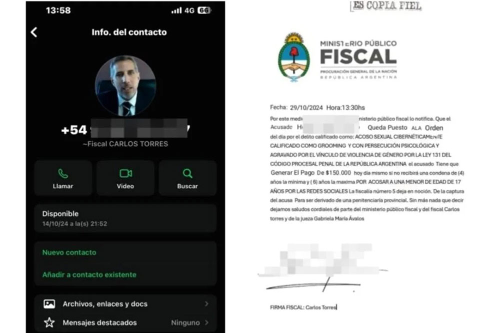 El segundo engaño es con otro perfil de Whatsapp donde se “envía un falso oficio con sellos del Ministerio Público Fiscal y tiene en su perfil la foto del fiscal general Luciani, pero no usa su nombre, sino que se identifica como el fiscal Carlos Torres”.