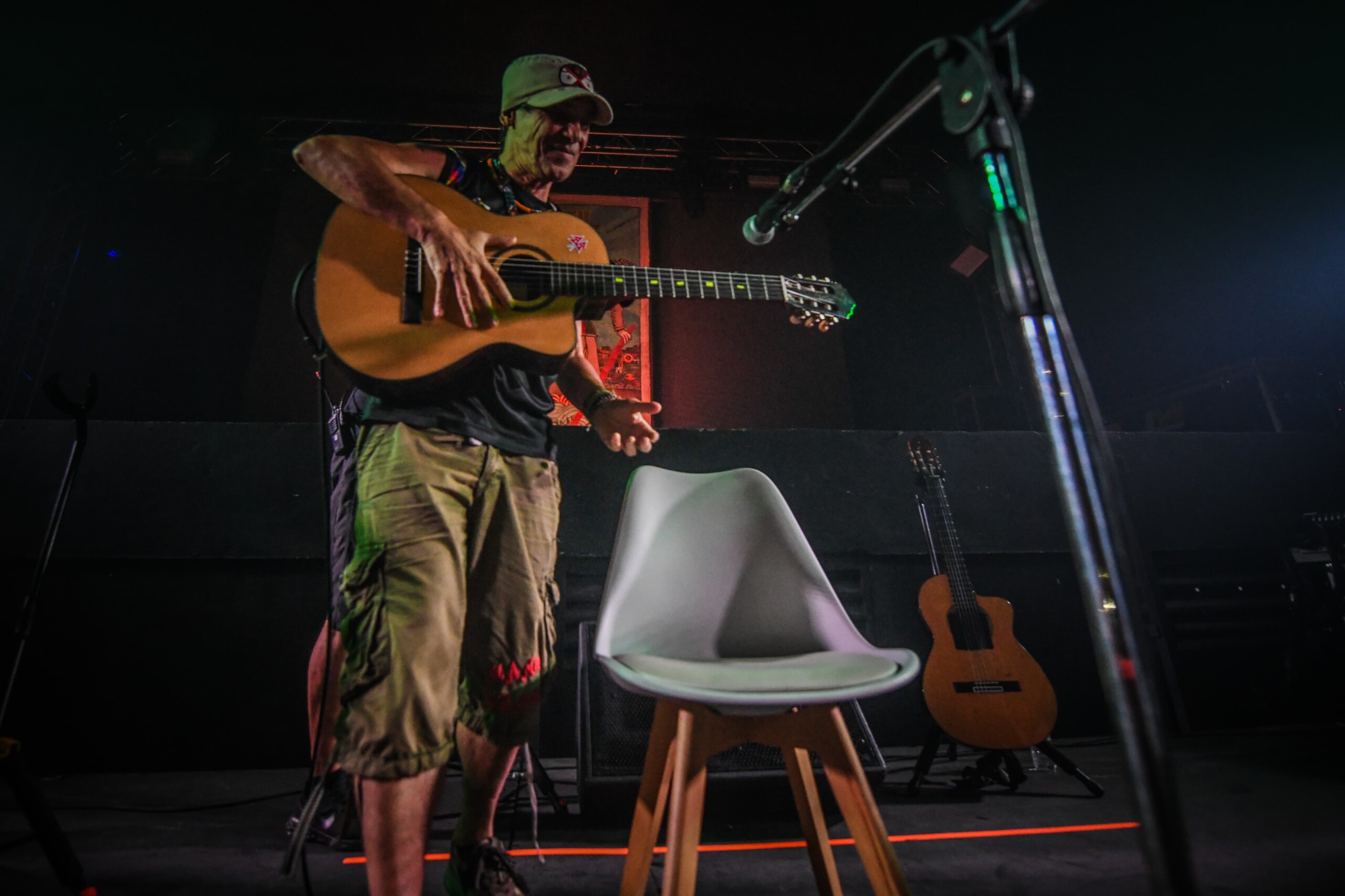 “Ultra acústica” está titulada la gira de Manu Chao que salta de Argentina a Guatemala a partir de la semana próxima. Dos guitarras, dos guitarristas, una pandereta en la mano de Rayo y sus viscerales hiphoperos mensajes de igualdad, justicia y derechos para todos. Tres sillas y una sala llena, completa de jóvenes, otros que parecían y los resignados a ya no intentarlo, todo prolijo en tamaño, luces y sonido.