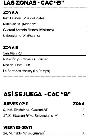 Guaraní integrará la Zona A junto a los equipos Instituto Einstein de Mar del Plata; Murialdo “A” de Mendoza y Universitario “A” de Rosario. En la Zona B están San Juan RC, Natación y Gimnasia de Tucumán, Mar del Plata Club y La Barranca Hockey de La Pampa.