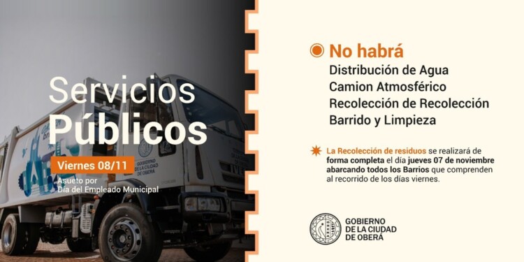 La Municipalidad de Oberá informó que este viernes 8 de noviembre no se prestarán varios servicios públicos debido a la celebración del Día del Empleado Municipal y al asueto administrativo. Por este motivo, no se realizará la recolección de residuos, ni se brindarán los servicios de distribución de agua potable, barrido de calles y atmosférico.