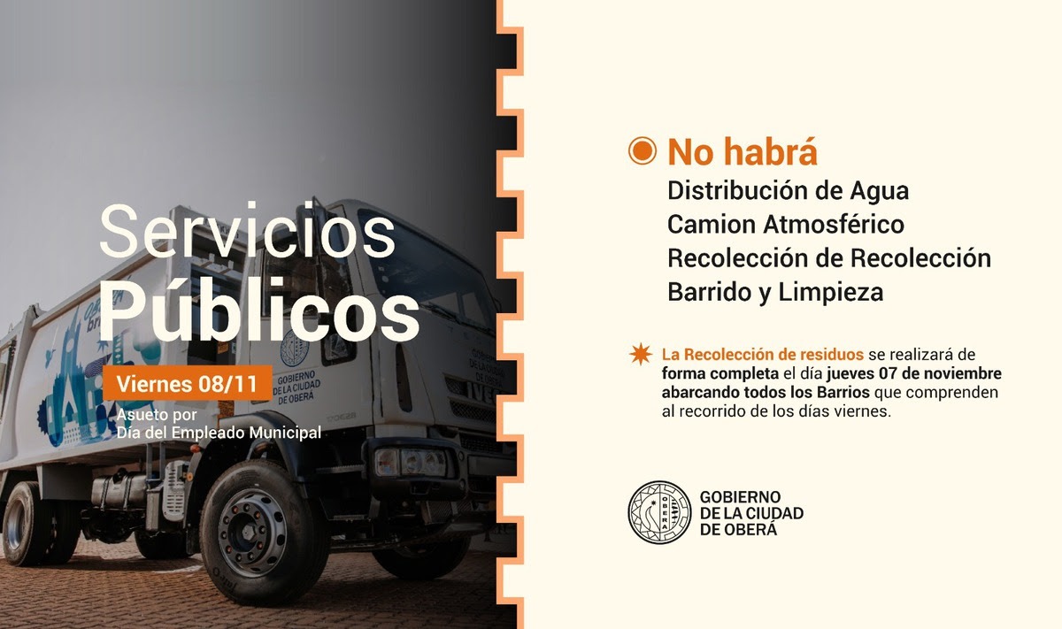 La Municipalidad de Oberá informó que este viernes 8 de noviembre no se prestarán varios servicios públicos debido a la celebración del Día del Empleado Municipal y al asueto administrativo. Por este motivo, no se realizará la recolección de residuos, ni se brindarán los servicios de distribución de agua potable, barrido de calles y atmosférico.