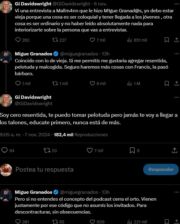 La internauta replicó, intentando suavizar el tono de la conversación: “Soy cero resentida, te puedo tomar pelo… pero jamás te voy a llegar a los talones, educate primero, nunca está de más”. Sin embargo, Granados se mantuvo firme en su postura y contestó: “Pero si no entendés el concepto del podcast cerrá el or… Los invitados vienen justamente por ese código que no asumís. Para descontracturar, sin obsecuencias”.
