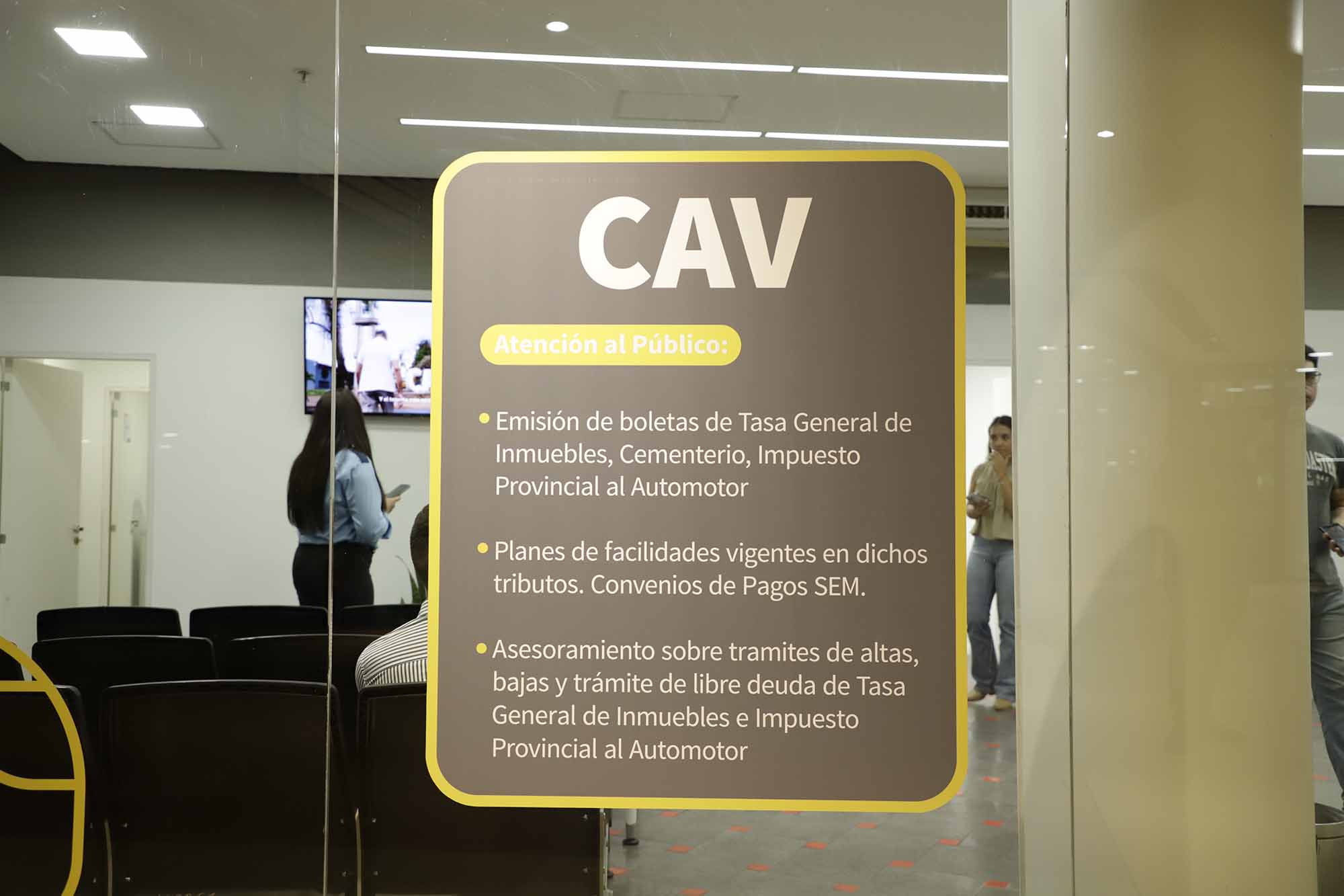 Además, en el mismo lugar funciona un Centro de Atención al Vecino (CAV), donde se pueden realizar varios trámites: Emisión de boletas de Tasa General de Inmuebles, cementerio, Impuesto Provincial al Automotor, planes de facilidades vigentes en dichos tributos, convenios de pagos SEM. También asesoramiento sobre trámites de altas, bajas y trámite de libre deuda de Tasa General de Inmuebles e Impuesto Provincial al Automotor.
