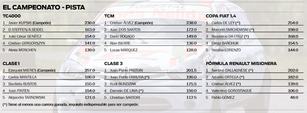 Tras las consagraciones previas de Javier Kupski (TC4000), Ezequiel Mieres (Clase 1) y Cristian Álvez (TCM), todas las miradas estarán puestas ahora en la definición del título en la Clase 3, la Copa Fiat 1.4 y la Fórmula Renault Misionera.