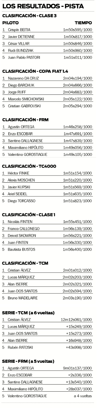 Y en cuanto a la Fórmula Renault Misionera, que busca a su primer campeón de la historia, el escolta Agustín Ortega hizo la pole y también ganó la serie, por lo que le puso presión al líder Santino Dallagnese.