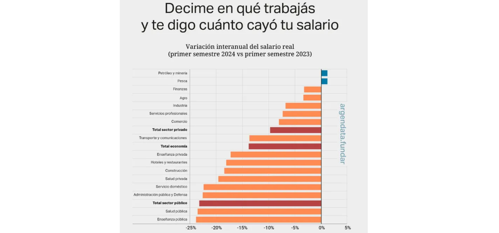 A modo de ejemplo, los sueldos de los empleados estatales en agosto estuvieron 16,5% por debajo del nivel de noviembre de 2023, según datos del INDEC, mientras se estima que los trabajadores informales también perdieron cerca de un 20% en términos reales durante los primeros meses del mandato libertario (aunque en este caso la medición es más inexacta).