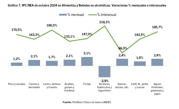 En la medición interanual, las tres divisiones con la mayor suba de precios del NEA a octubre son Verduras, tubérculos y legumbres (218,3%), Leches, lácteos y huevos (196,5%) y Aguas minerales, jugos y gaseosas (185,7%).