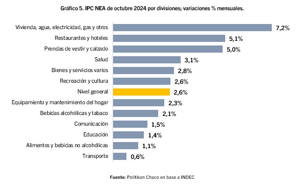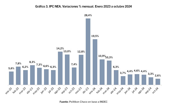 El incremento del 2,6% registrado en el NEA es levemente inferior al promedio nacional de 2,7% y está 0,7 puntos porcentuales por debajo de la medición anterior, según un análisis de la consultora Politikon Chaco que refleja que para encontrar una cifra menor a la de este octubre “hay que remontarse a agosto de 2020, cuando marcó 2,3%”.