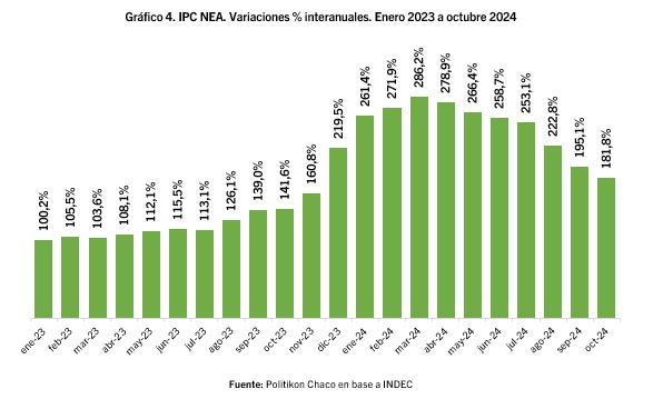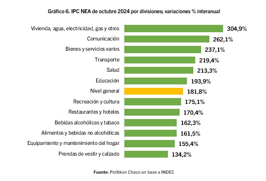 En la medición interanual, las tres divisiones con la mayor suba de precios del NEA a octubre son Verduras, tubérculos y legumbres (218,3%), Leches, lácteos y huevos (196,5%) y Aguas minerales, jugos y gaseosas (185,7%).