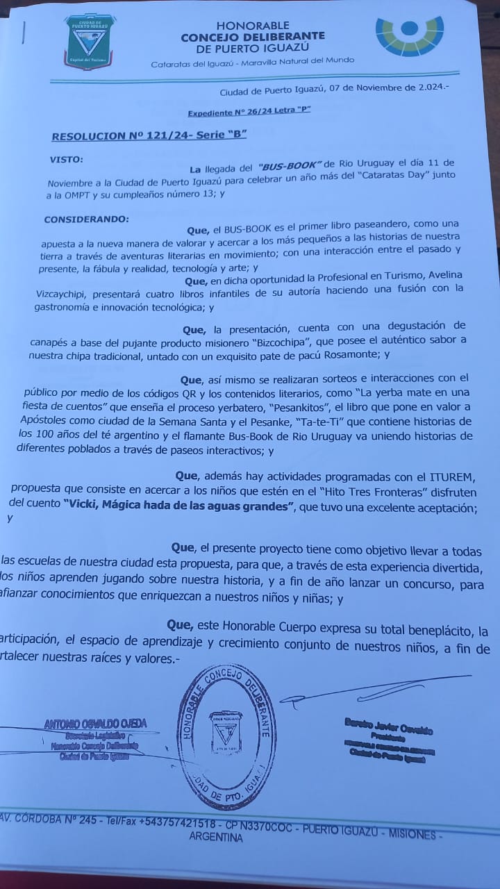 En el marco de las celebraciones por el “Cataratas Day”, que se celebra cada 11 de noviembre en Misiones para celebrar el  aniversario de la declaración de las Cataratas del Iguazú como Maravilla Natural del Mundo, Río Uruguay lanzó en Puerto Iguazú el “bus book”, una novedosa herramienta para acercar la cultura local y provincial a los turistas y que, rápidamente, fue declarada de interés municipal por el Concejo Deliberante.