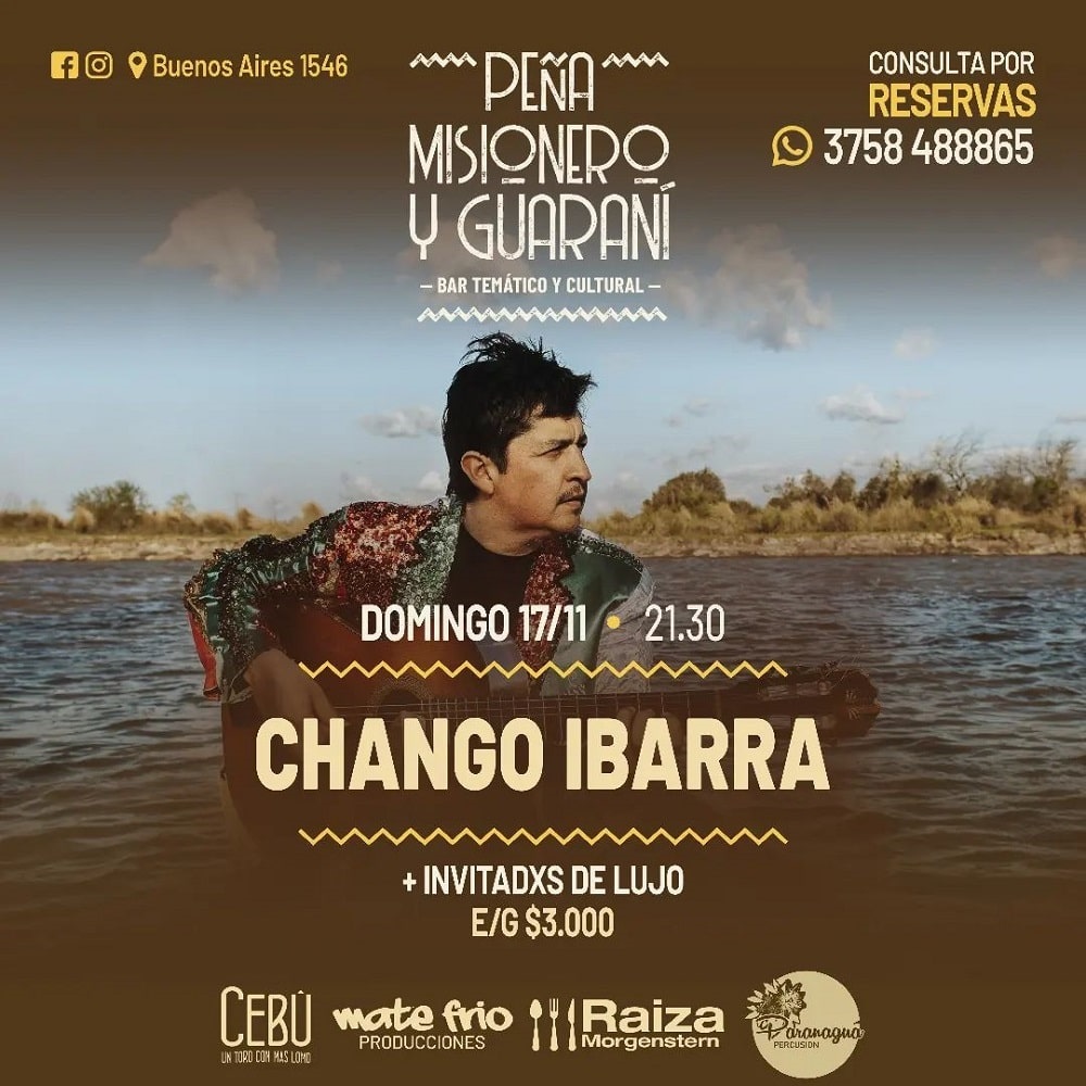 Misionero y Guaraní (Buenos Aires 1546), recibe este domingo, a las 21.30 horas, al músico y compositor, Chango Ibarra. Entrada: $3.000. Reservas al 3758 488865.