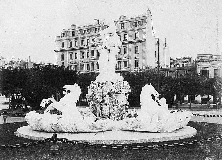 En 1902 presentó la Fuente Monumental de las Nereidas, luego de sortear varios obstáculos en el trasporte y armado, pero se vio envuelta en un escándalo porque había tallado figuras completamente desnudas y estaba ubicada al frente de la Catedral.