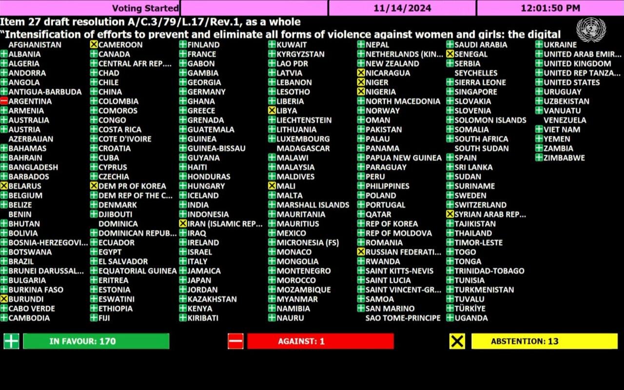 La representación argentina en la Asamblea General de la Organización de las Naciones Unidas (ONU) decidió convertirse hoy en el único país en votar en contra de una resolución en la que se promovía la “intensificación de los esfuerzos para prevenir y eliminar toda forma de violencia digital contra las mujeres y las niñas”.