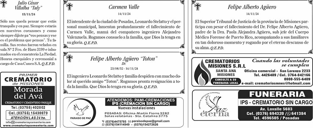 Fúnebres del Viernes 15 de Noviembre de 2024