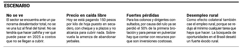 Lo que se puede evaluar de primera mano, es que la plaga afecta a la zafriña con una calidad de la yerba que ya está comprometida. Se teme además, que de no poder hacer frente con los tratamientos, los yerbales no lleguen bien a la zafra gruesa que arranca en marzo de 2025. Como efecto colateral también cae el empleo rural, porque se redujo al mínimo cualquier tarea que haya que hacer.