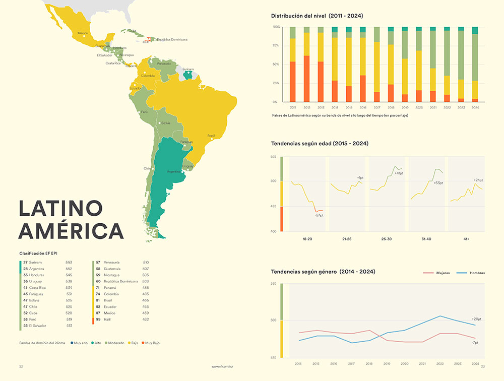 No extraña, en consecuencia, que Argentina haya liderado por años el ranking internacional EF English Proficiency Index, hasta que en la última edición 2024 la desplazó por apenas un punto del primer lugar en América Latina un nuevo participante: Surinam, con una puntuación de 563.