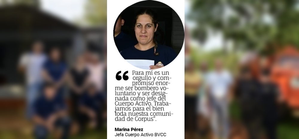 Los Bomberos Voluntarios de Corpus Christi, una novel institución que cumplió sus primeros dos años de vida, ya cuenta con su primera bombera, Marina Pérez, quien completó su formación y como consecuencia de ello fue nombrada jefa del Cuerpo Activo.
