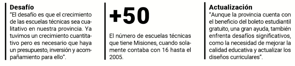En la misma línea dijo que “hay escuelas que están mostrando todo su potencial porque quizás tienen acceso a mayores recursos, otras que supieron aprovecharse del momento en que la escuela técnica tenía muchos recursos destinados por parte de los programas de Nación y también están las que deben ajustarse mucho porque hoy estamos en una época de crisis, de vaca flaca. Se nota mucho la diferencia con aquellas escuelas que no tienen o no supieron o no pudieron por ahí administrarse en esos tiempos. Entonces las situaciones son desparejas en toda la provincia”.