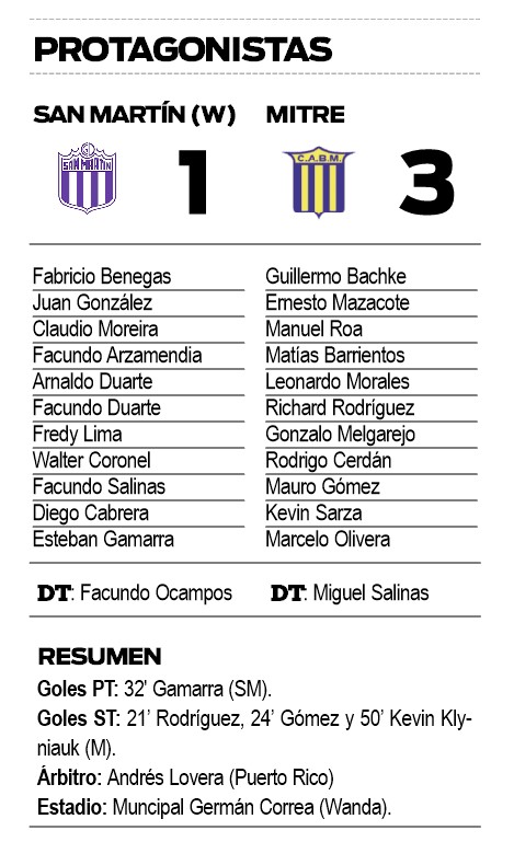 Pese a que comenzó perdiendo, Bartolomé Mitre supo reponerse en la etapa complementaria y venció en esta calurosa tarde de domingo a San Martín de esta ciudad por 3 a 1, finalizando así con puntaje ideal en la Zona 5 de la Región Litoral Norte del Torneo Regional Federal Amateur de Fútbol.