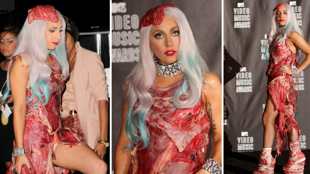 Uno de los vestidos más curiosos y peculiares de todos los tiempos fue el utilizado por la cantante Lady Gaga en la gala de los premios MTV Video Music Awards, en el año 2010. Fue confeccionado en su totalidad con carne de ternera, conocido popularmente como el “vestido de carne”.