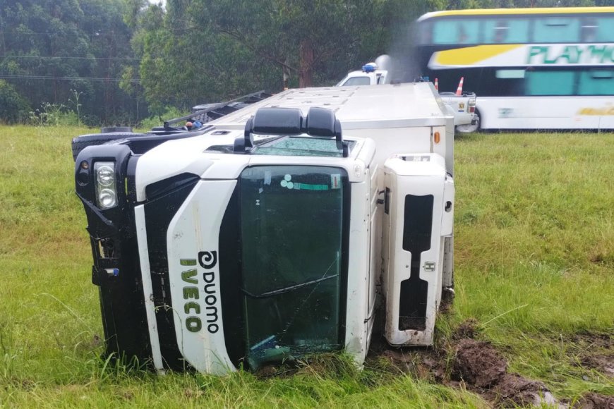 El camión terminó volcado hacia su izquierda, a un costado del camino. A pesar de lo impactante del incidente, el conductor resultó ileso.
