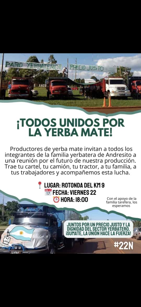 Bajo el lema “Todos unidos por la yerba mate”, los productores misioneros se convocaron a una movilización en la Rotonda del Kilómetro 9 de Andresito, para este viernes 22 de noviembre a las 18.
