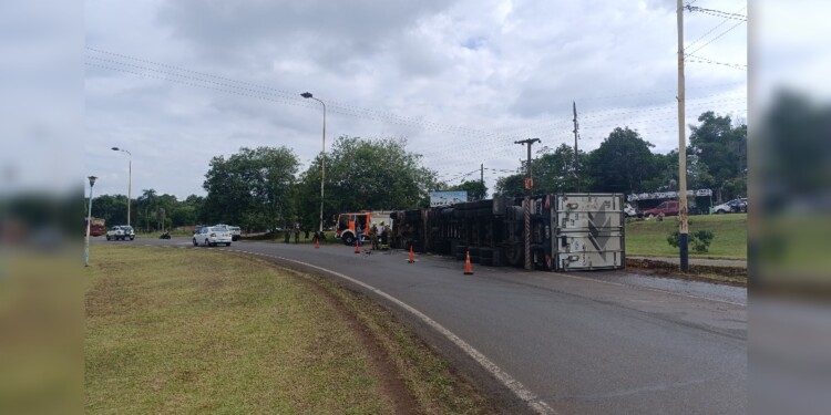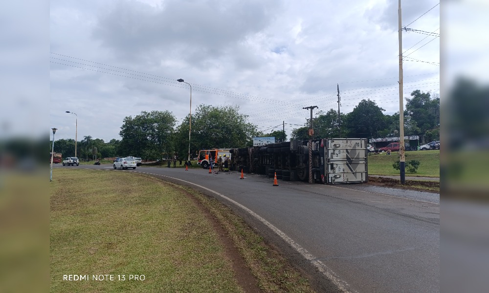 Un camión de gran porte protagonizó un despiste y volcó en la rotonda de acceso a Puerto Iguazú, sobre la Ruta Nacional 12, este viernes por la tarde.