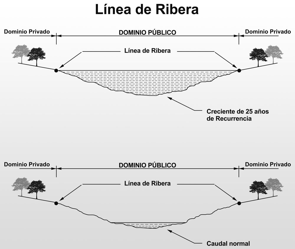 En primer lugar, el Artículo 235 de Código Civil y Comercial de la República Argentina hace una enumeración de los bienes de dominio público, excepto lo dispuesto por leyes especiales, y en su inciso c) nombra específicamente a: “Los ríos, estuarios, arroyo y demás aguas que corren por cauces naturales, lagos y lagunas navegables, los glaciares y el ambiente periglacial y toda otra agua que tenga o adquiera la aptitud de satisfacer usos de interés general …” y más adelante, en el mismo inciso define: “Se entiende por río el agua, las playas y el lecho por donde corre, delimitado por la línea de ribera que fija el promedio de las máximas crecidas ordinarias. Por lago o laguna se entiende el agua, sus playas y su lecho, respectivamente, delimitado de la misma manera que los ríos”. De acuerdo a este texto el concepto de línea de ribera se aplica a ríos, lagos y lagunas exclusivamente.