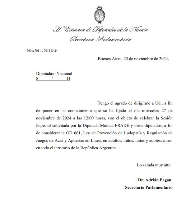 Frade difundió una carta dirigida a los bloques políticos de la Asociación de Loterías, Quinielas y Casinos Estatales de Argentina (ALEA) para que no se trate ese proyecto al considerar que es inconstitucional ya que sostiene que avanza sobre la autonomía de las provincias.
