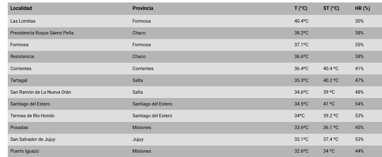 De acuerdo a los datos aportados por el Servicio Meteorológico Nacional (SMN) , Posadas alcanzó el octavo puesto y Puerto Iguazú el décimo en la lista por las altas temperaturas.