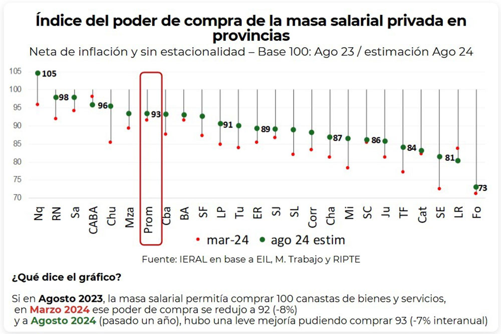 En la tabla discriminada por provincia, expresa que si en agosto de 2023 el promedio de la masa salarial privada podía comprar 100 canastas de bienes y servicios, para noviembre de 2024 la gran mayoría puede comprar menos. En el caso de Misiones, de comprar 100 solo llega a 87 canastas de bienes y servicios. Quiere decir que el promedio salarial en la Tierra Colorada perdió la posibilidad de comprar trece canastas en los últimos quince meses.