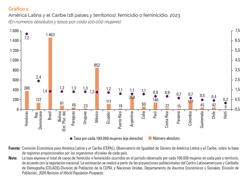 Honduras lidera la tasa más alta de femicidios en la región: 7,2 casos por cada 100.000 mujeres, seguido de República Dominicana (2,4) y Brasil (1,4). Chile, Haití y Guatemala reportan cifras menores, pero no necesariamente reflejan la magnitud real debido a deficiencias en el registro de casos.