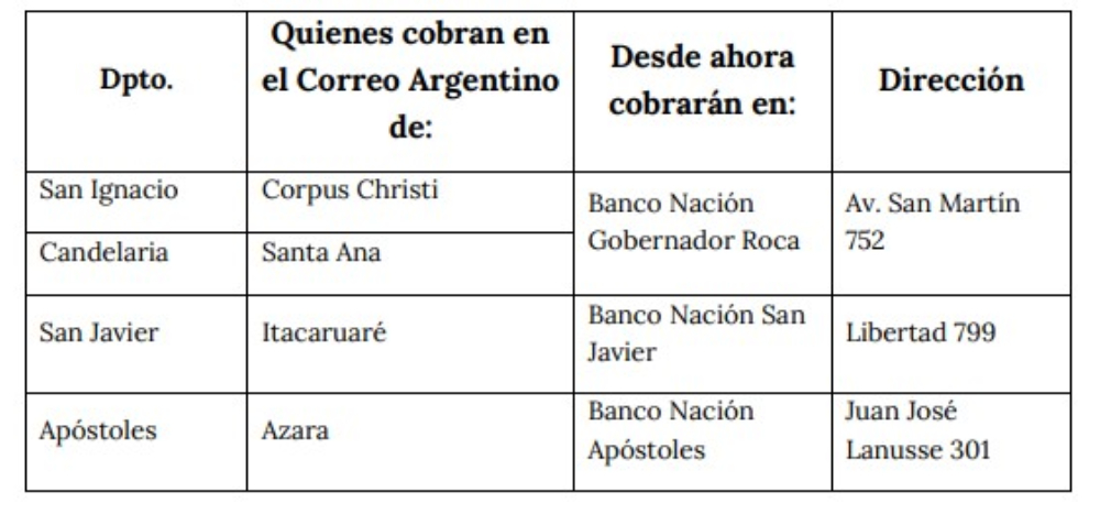 En tanto, aquellos que cobraban por medio de Correo Argentino en la localidad de Itacaruaré, ahora lo harán en el Banco Nación San Javier, situado en Libertad 799.