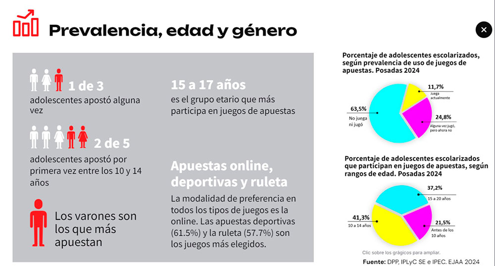 “Es decir que 1 de cada 3 estudiantes apostó en línea alguna vez. Otro dato revelador es que 2 de cada 5 adolescentes apostaron por primera vez cuando tenían entre 10 y 14 años… el 41,3% de los encuestados que participan en juegos de apuestas tienen entre 10 y 14 años y el 21,5% tiene menos de 10 años”, detalló Carolina Ocar del Instituto Provincial de Estadística y Censos.