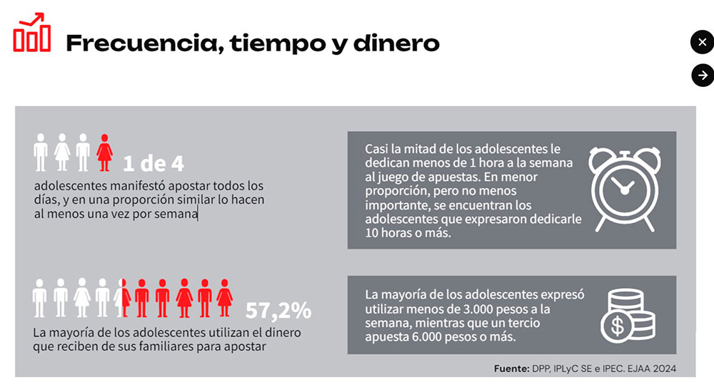 El 57,2% de los adolescentes indicó que utiliza para apostar el dinero que recibe de su familia, “lo que no significa que los familiares le dan dinero para este fin, sino que les facilitan este dinero que puede ser para comprarse alimentos u otros gastos”.